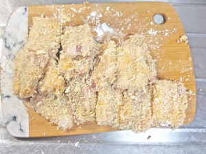 ![]() 2:切った豚肉に、薄力粉→溶き卵→パン粉の順に衣をつけましょう。 |