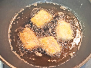 ![]() 4:蓋をして、片面3~4分揚げて、ひっくり返したら、もう片面も3~4分揚げましょう。 ※衣がきつね色になるまでしっかりと火を通してください。 |