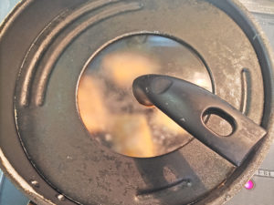 蓋をして揚げると、中まで火が通るので便利ですが、蓋の水蒸気が下に落ちると、跳ねて火傷の心配があるので、水平に動かして、水が落ちないように気を付けてください。