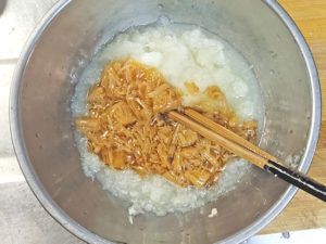 ![]() 6:大根おろしと瓶から出したなめたけを混ぜ合わせ、おろしキノコソースを作りましょう。 |