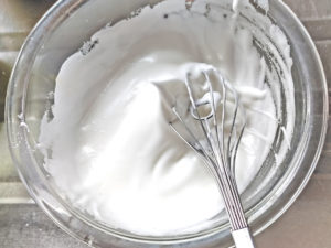 ![]() 1:卵黄と卵白を別々のボールに入れ、生地用砂糖も半量ずつに分けます。 2:卵白に半量の砂糖から一つまみ加えて泡立て始め、途中二回に分けて砂糖を加え、ピンと角が立つまで泡だててメレンゲを作りましょう。 |
