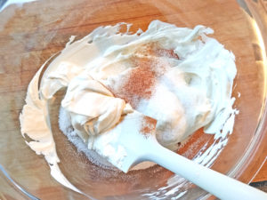 ![]() 13:別の耐熱ボールにクリームチーズを入れ、レンジで30秒ほど加熱して、柔らかくしましょう。 14:チーズが柔らかくなったら、砂糖、シナモンパウダーを加えて、クリーム状になるまで混ぜます。 |
