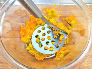 ![]() 12:南瓜は熱いうちにマッシャーでつぶし、裏ごしをしておきます。 |