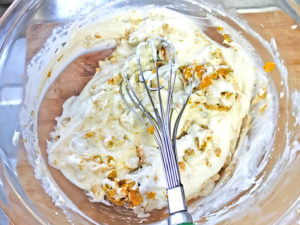 ![]() 8:卵黄のボールにメレンゲをすべて加え、ゴムべらに持ち替えて、さっくりと練らないように混ぜます。 |