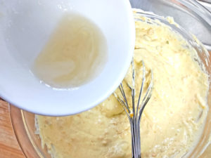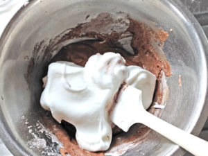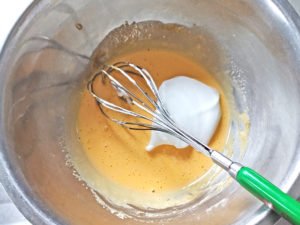 ![]() 6:メレンゲをひとすくい生地に加え、なじむまでよく混ぜましょう。 |