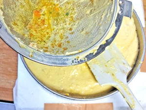 ![]() 18:冷めたケーキの上に、再び裏ごししたチーズ液を流し入れ、平らにならしたら、冷蔵庫で30分以上冷やします。 |