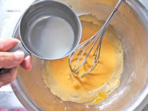 ![]() 3:卵黄のボールに生地用グラニュー糖の残りを加えて泡立て、白っぽくとろりとするまで泡だてます。 |