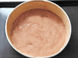 ココアスポンジケーキを焼いた後は、シートを敷いたままで粗熱を取り、そのままレアチーズを流し入れるとセルクルの代わりになります。
