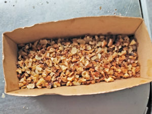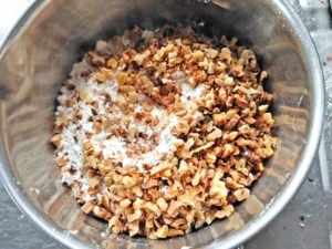 ![]() 2:粗熱を取り、ナッツを細かく刻み、大きめのボールに薄力粉と一緒に入れておきましょう。 |