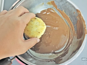![]() 12:ブレッドの1枚の側面を水平に持ち、チョコがビスケットの半分まで来るようにそっと浸します。 13:チョコを付けたら、チョコの面を上にして、天板の上で固まるまで冷ましましょう。 |