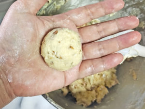 ![]() 6:生地を20等分し、手に軽く粉(分量外)をつけたら、それぞれをボール状に丸めましょう。 |