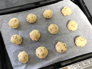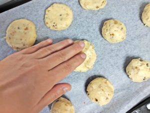![]() 7:天板にクッキングシートを敷き、その上に広めに間隔をあけて、シート上に置きます。 |