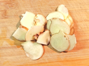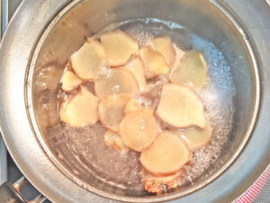 1:生姜はきれいに洗い、皮つきのまま2mmほどの薄切りにします。