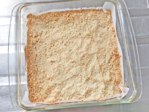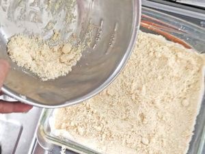 6:取っておいた生地を上にふりかけ、加熱したオーブンで明るい黄金色になるまで25~28分焼きましょう。