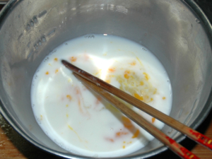 ![]() ⑤ボールに衣Aの材料を入れ、卵がしっかりとほぐれるようにします。 |