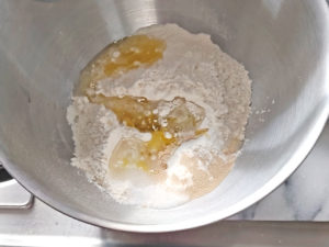 ![]() 1:スタンドミキサーに、強力粉、塩、ドライイースト(塩の反対側に)、グラニュー糖、生地用オリーブオイルを入れます。 |