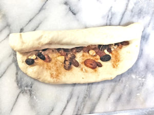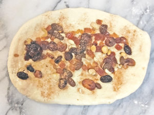 ![]() 10:生地を一つ取り、めん棒で長方形に伸ばしたら、シナモンシュガーを小1ずつ、生地の表面にふりかけましょう。 11:1/3量のナッツとドライフルーツを乗せ、軽く押し込むようにします。 |