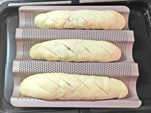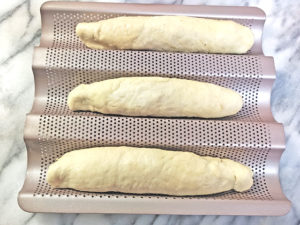 ![]() 14:生地をロール状にしたら、クッキングシートを敷いた天板(またはフランスパン専用の天板)の上に乗せて、ラップをして、オーブンの30度で1時間発酵させましょう。 |