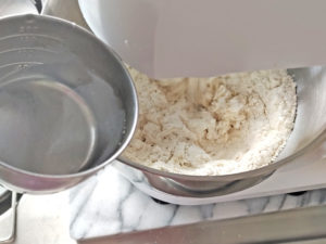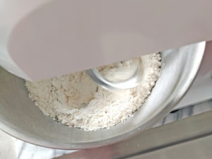 ![]() 2:スタンドミキサーにドゥーフックを装着して、水1/3量を入れて、低速で捏ねましょう。 ※冬場は水が冷たいので、30度くらいのぬるま湯を使って下さい。 |