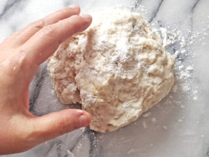 ![]() 4:台に強力粉(分量外)で打ち粉をし、生地を取り出し、生地の上にも軽く打ち粉をしたら、表面が滑らかになるまで手で捏ねましょう。 |