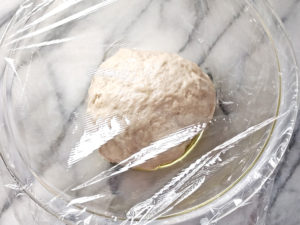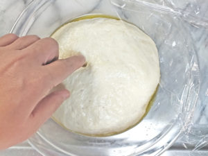 ![]() 5:大き目の耐熱ボールにオリーブオイル大1弱(分量外)を塗り、丸めた生地を入れます。 6:35度のオーブンで90分~120分発酵させましょう。 |