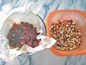 ![]() 7:ドライフルーツは水気を切り、ナッツは細かく刻みます。 ※マイヤーズラムにママパンのミックスドライフルーツを漬け込んだものを使用しています。 |