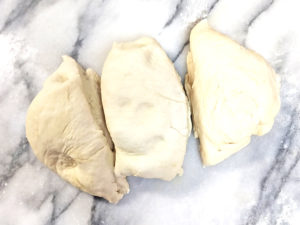 ![]() 9:生地を台に取り出し、再び打ち粉をして軽くまとめたら、スケッパーで3等分します。 |
