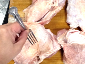 ![]() ①鶏肉は、皮の方にフォークで数カ所穴をあけておきます。 |