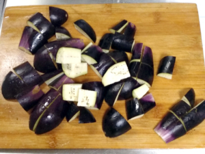 ![]() ③ナスはヘタを取り、小さめの乱切りにします。 |