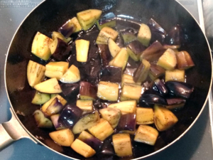 ![]() ⑤フライパンに多めに油(分量外)を引き、なすがくたっとするまで炒めましょう。 (ナスは油を吸いやすいので、途中油を継ぎ足しながら焼いてください。) |