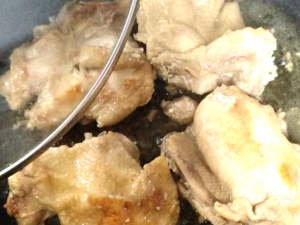 ![]() ⑦鶏もも肉は別のフライパンに薄く油(分量外)を引き、両面に焼き色を付けておきます。 |