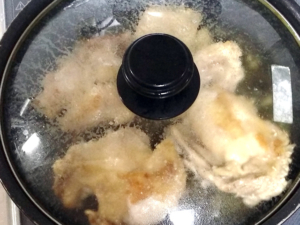 ![]() ⑧焼き色がついたら、蓋をして、弱火で10~12分蒸し焼きにしましょう。 (火が通らないと危険なので、しっかり目に火を通してください。) |
