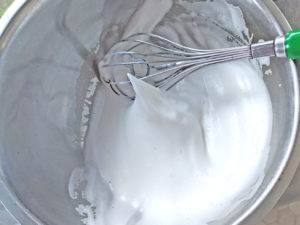 ![]() 2:卵白に砂糖を一つまみ加えて泡立て始め、途中二回に分けて砂糖を加え、ピンと角が立つまで泡立ててメレンゲを作りましょう。 |