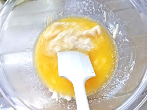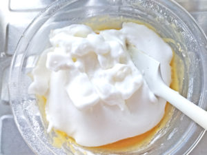 ![]() 6:メレンゲを全て耐熱ボールの方に加え、ゴムベラに持ち替えて、練らないようにさっくりと混ぜましょう。 |