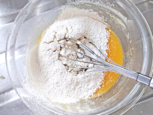 ![]() 5:耐熱ボールに薄力粉とベーキングパウダーを一緒にふるい入れ、泡だて器で粉っぽさがなくなるまで混ぜます。 |