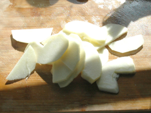 ②ケーキ型に型用グラニュー糖を散らし、薄切りりんごを重ねて並べましょう。