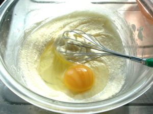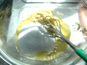 ⑤ボールに卵を1個ずつ割り入れ、その都度良く混ぜます。