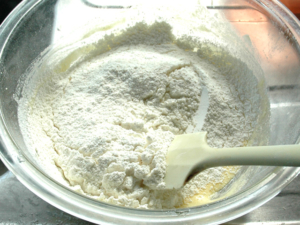 ⑥薄力粉とベーキングパウダーを一緒にふるい入れ、ゴムベラでさっくりと混ぜます。