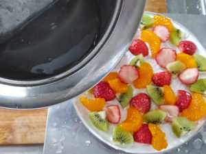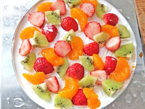 14:30分経ったら、飾り用の苺を半分にカットしたものと、キウイの皮をむき小さく切ったもの、みかんの缶詰などを使い、表面に飾り付けましょう。