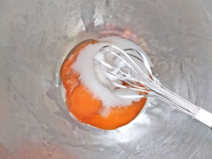 3:卵黄のボールに卵黄用の砂糖を加えて泡立て、白っぽくとろりとするまで泡立てます。