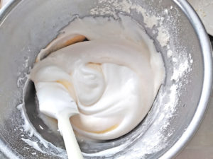 7:卵黄のボールにメレンゲをすべて加え、ゴムべらに持ち替えて、さっくりと練らないように混ぜます。