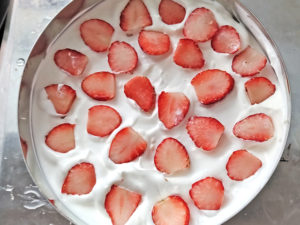 11:18cmのセルクルを用意し、生地を1枚敷き、クリーム用砂糖と泡立てたクリームの1/4量を塗り、薄く切ったサンド用の苺を敷き詰めます。