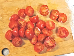 ![]() 1:ミニトマトはヘタを取り、それぞれ半分にカットします。 |