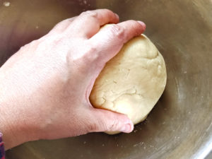 ![]() 3:生地をボールに取り出し、手で生地をこね、しっかりとしたボール状にまとめましょう。 |