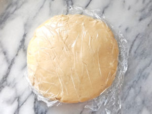 ![]() 4:平たい円状にまとめたら、ラップで包み、冷蔵庫で10~15分ほど休ませます。 ※生地は15分以上放置すると、硬くなりすぎて伸ばせなくなるので短めに。 |