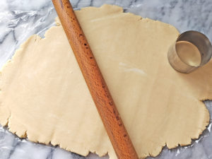 ![]() 5:生地をラップから取り出し、コインの厚さ(3mm)よりやや薄くなるまで、めん棒で伸ばしましょう。 |