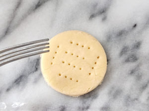 ![]() 6:丸いクッキー型(6cmほど)で抜き出して、フォークで均一に穴を開けます。 ※今回は円いセルクルの6cmを使いました。 |