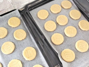 ![]() 7:クッキングシート状に生地を少し離して並べましょう。 |