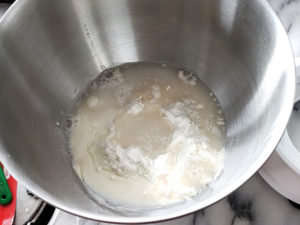 1:スタンドミキサーのボールに、強力粉、塩、スキムミルク、上白糖、ドライイースト(塩の反対側に)を入れ、ぬるま湯も流し入れます。