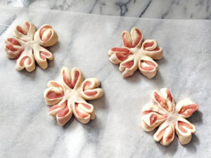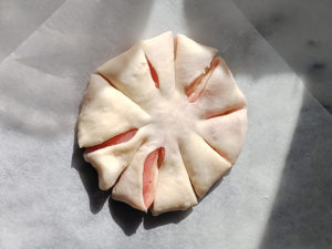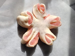 16:切り込みを入れた生地を、両隣同士、餡が上になるように、立ててくっつけてから、軽く手のひらで押して平らにします。